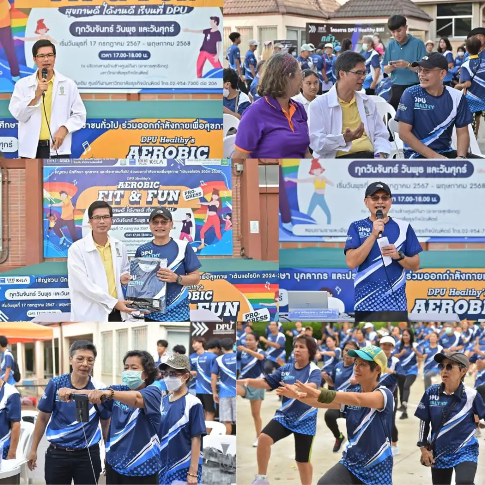 เมื่อวันที่ 17 ก.ค.67 ผศ.ดร.วันวร จะนู ผู้เชี่ยวชาญพิเศษอาวุโส Student Support & Services มหาวิทยาลัยธุรกิจบัณฑิตย์ พร้อมด้วย นายสุรัตน์ เปี่ยมศิริ หัวหน้าฝ่ายพัฒนาชุมชนและสวัสดิการสังคม และ นางสาวดาราณี โพธิน อนุกรรมการกองทุนหลักประกันสุขภาพเขตหลักสี่ ร่วมกันเปิดโครงการส่งเสริมสุขภาพป้องกันโรคเต้นแอโรบิค "Fit & Fun (Progress)" ณ ลานข้างศูนย์กีฬา ม.ธุรกิจบัณฑิตย์ ท่ามกลางนักศึกษา ครู อาจารย์ เจ้าหน้าที่ และผู้ที่สนใจเข้าร่วมกิจกรรมอย่างคับคั่ง
