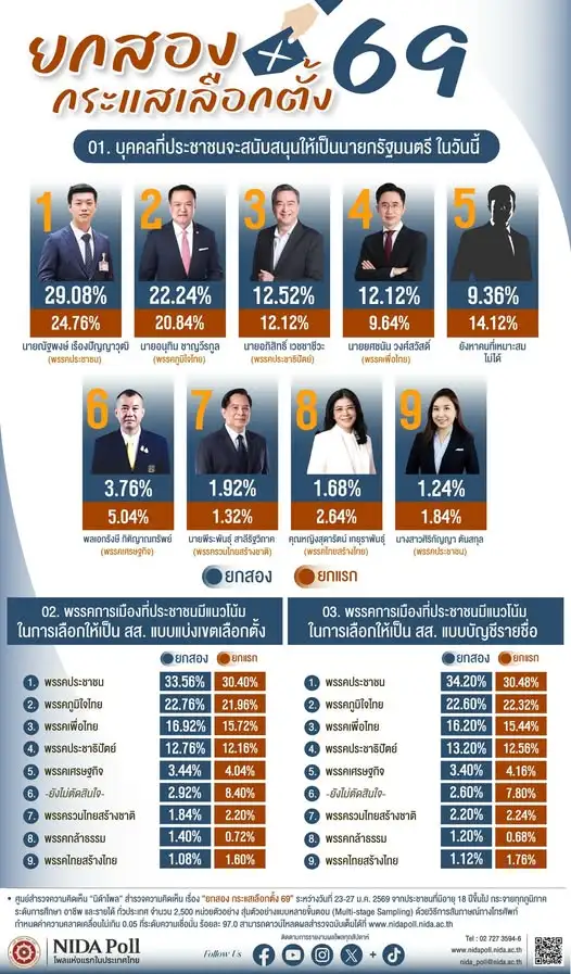 10:02น. –สำนักข่าวอินโฟเควสท์ (IQ) ศูนย์สำรวจความคิดเห็น "นิด้าโพล" สถาบันบัณฑิตพัฒนบริหารศาสตร์ (นิด้า) เปิดเผยผลการสำรวจ เรื่อง "ยกสอง กระแสเลือกตั้ง 69" ทำการสำรวจระหว่างวันที่...