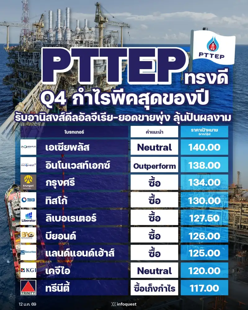 11:31น. –สำนักข่าวอินโฟเควสท์ (IQ) โบรกเกอร์เชียร์ "ซื้อ" หุ้น บมจ.ปตท.สำรวจและผลิตปิโตรเลียม [PTTEP] คาดกำไรสุทธิไตรมาส 4/68 ดีสุดของปี 68 รับกำไรพิเศษสูงกว่าคาด ทั้งจาก Oil hedging,...