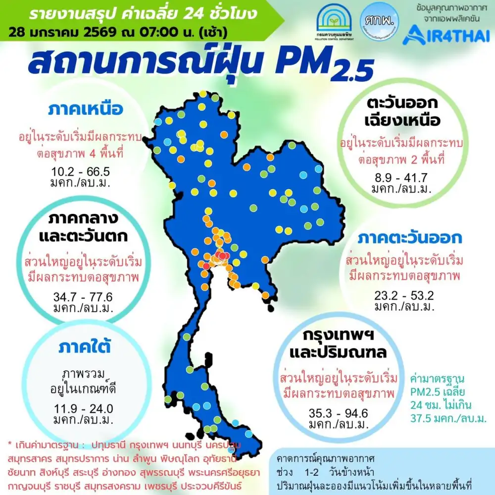 10:35น. –สำนักข่าวอินโฟเควสท์ (IQ) ศูนย์สื่อสารการแก้ไขปัญหามลพิษทางอากาศ รายงานการติดตามตรวจสอบคุณภาพอากาศประจำวันที่ 28 ม.ค.69 เมื่อเวลา 07.00 น.พบปริมาณฝุ่นละอองพิษ PM2.5...