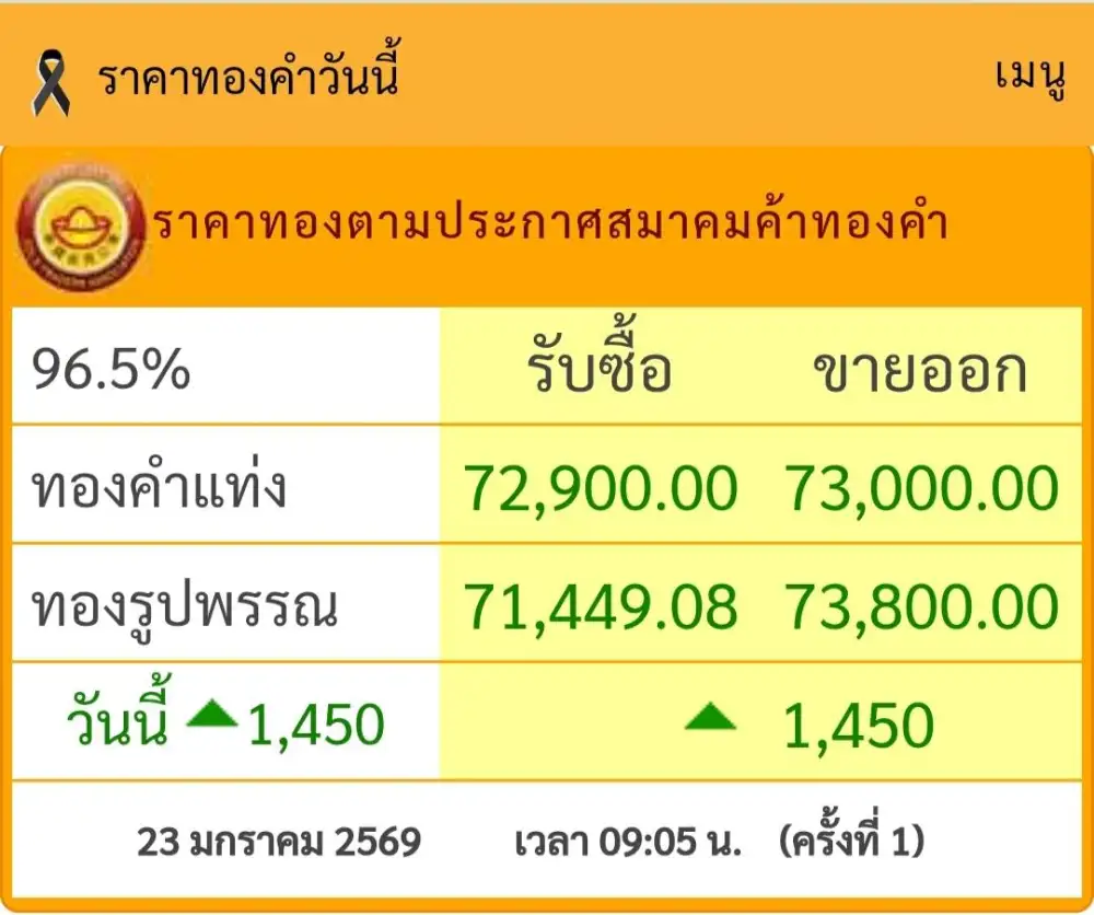 09:56น. –สำนักข่าวอินโฟเควสท์ (IQ) ราคาทองคำ 96.5% ขายปลีกในประเทศเปิดตลาดเช้านี้ ปรับตัวพุ่งพรวดจากเมื่อวานบาททองคำละ 1,450 บาท ตามทิศทางราคาทองคำในตลาดโลกโดยสมาคมค้าทองคำ...