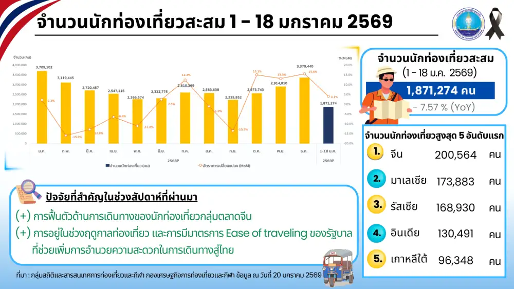 16:43น. –สำนักข่าวอินโฟเควสท์ (IQ) น.ส.นัทรียา ทวีวงศ์ ปลัดกระทรวงการท่องเที่ยวและกีฬา กล่าวว่า ในช่วงสัปดาห์ที่ผ่านมา (วันที่ 12-18 ม.ค. 69)...