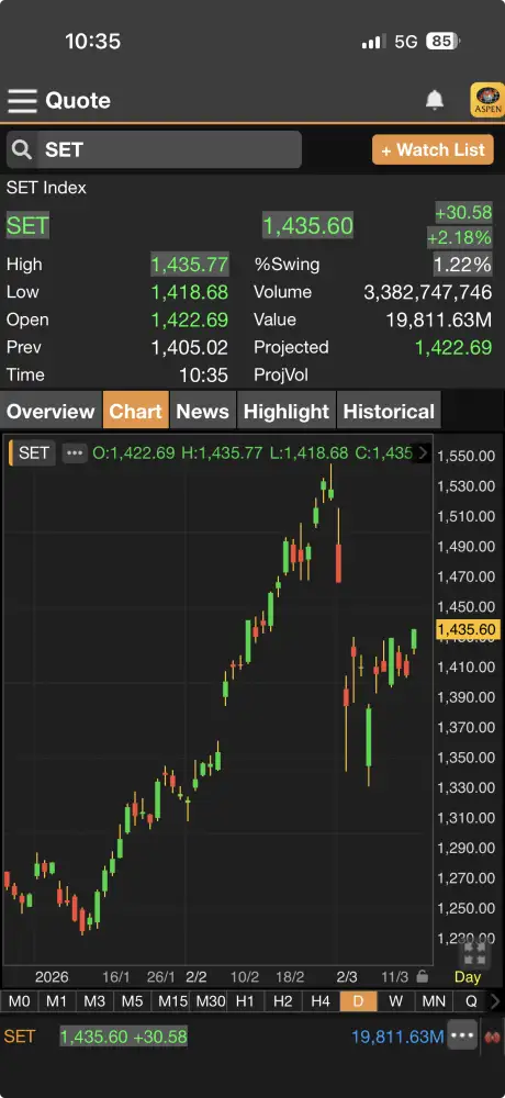 10:07น. –สำนักข่าวอินโฟเควสท์ (IQ) ตลาดหุ้นไทยภาคเช้าดีดขึ้นไปแรงกว่า 30 จุด ตามทิศทางตลาดต่างประเทศ ตอบรับราคาน้ำมันโลกร่วงหลังมีรายงานว่าเรือบรรทุกน้ำมันบางลำสามารถแล่นผ่านช่องแคบฮอร์...