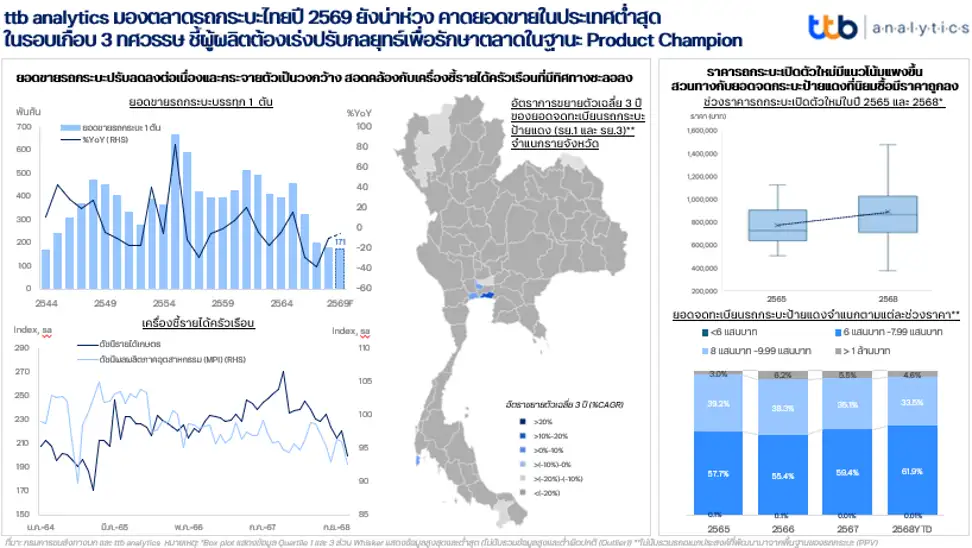 16:04น. –สำนักข่าวอินโฟเควสท์ (IQ) ศูนย์วิเคราะห์เศรษฐกิจ ทีทีบี (ttb analytics) คาดยอดขายตลาดรถกระบะบรรทุก 1 ตัน ในปี 2569 จะอยู่ที่ 1.71 แสนคัน หรือ หดตัว 7%...