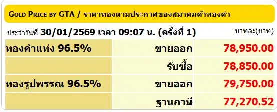 30 ม.ค. –สำนักข่าวอินโฟเควสท์ (IQ) รายงานราคาทอง (ทองคำ 96.5%) ประจำวันที่ 30 มกราคม 69 ณ เวลา 09:07 ตามประกาศของสมาคมค้าทองคำซื้อ (บาท) ขาย (บาท)ทองคำแท่ง ...