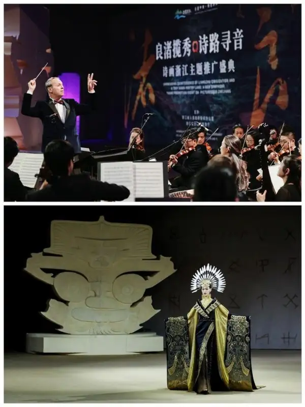 During the event, guests lit up the Luminous Jade Cong Column, which represented Liangzhu Civilization, launching the ceremony of the Promotion, as witnessed by people from all walks of life. The Promotion consisted of two parts, including the symphony "Sound on a Trip Down Poetry Lane", which will debut globally after the event, and a trans-boundary performance, "Showcasing Quintessence of Liangzhu Civilization". "Sound on a Trip Down Poetry Lane" is a new symphony composed by Hollywood musician Mr. Mark Chait, winner of Emmy and Telly Awards. Themed "Searching for Beautiful Voices Along Poetry Road", it is a musical work that embodies international fashion and Zhejiang characteristics. During the event, Mr. Mark Chait conducted the symphony together with Ding Yang, a world-class piano player, and major members of the Zhejiang Symphony Orchestra. Four other well-known international musicians, Russian classical violinist Yury Revich, American violinist Igor Pikayzen,German cellist Benedict Kloeckner, and Japanese violist Tomoko Akasaka, also participated in the debut performance of the symphony through the internet. The flowing musical notes, which made audiences seem to walk in the picturesque Zhejiang, touched everyone's heart, helping present Zhejiang in a richer and more sensitive way.