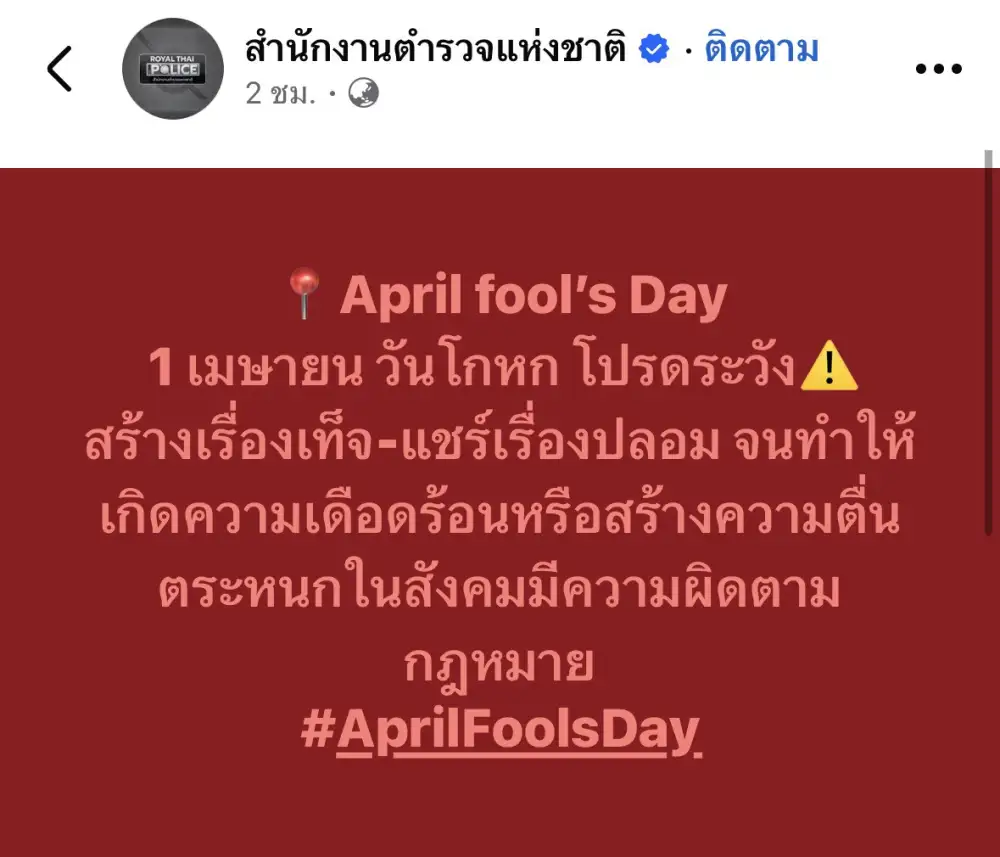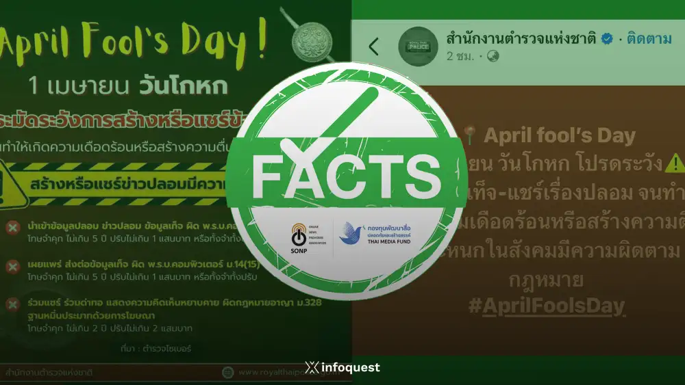 "April Fools' Day" แค่โพสต์เล่นๆ แชร์เล่น ๆ แต่นอนคุกจริง !? จากข้อมูลในโลกโซเชียลที่เผยแพร่ในประเด็น "การส่งต่อข้อมูลเท็จในวัน April Fools' Day สร้างความตื่นตระหนก มีโทษทั้งจำทั้งปรับ"