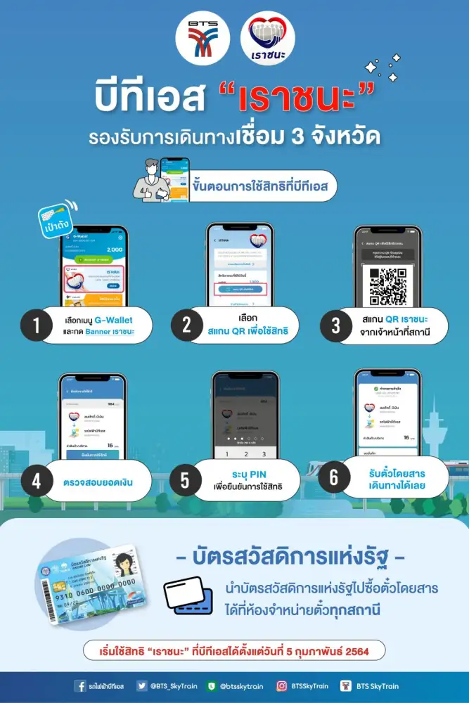 นายสุรพงษ์ เลาหะอัญญา กรรมการผู้อำนวยการใหญ่ บมจ.ระบบขนส่งมวลชนกรุงเทพ ผู้ให้บริการรถไฟฟ้าบีทีเอส บริษัทในกลุ่มบมจ.บีทีเอส กรุ๊ป โฮลดิ้งส์ (BTS) แจ้งว่า ตามผลการประชุมคณะรัฐมนตรี (ครม.) เรื่องของโครงการ "เราชนะ" โดยมีข้อกำหนดให้สามารถจัดใช้วงเงินดังกล่าว ในการชำระค่าบริการระบบขนส่งสาธารณะต่าง ๆ ทุกประเภท ยกเว้นทางอากาศ เมื่อวันที่ 26 มกราคม 2564 ที่ผ่านมา เพื่อช่วยแบ่งเบาและลดภาระค่าใช้จ่ายในการเดินทาง ลดการสัมผัสเงินสด เพื่อสร้างความปลอดภัย มั่นใจในการเดินทางให้กับประชาชน