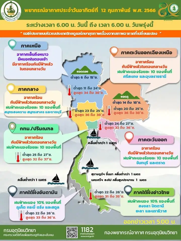 กรมอุตุนิยมวิทยา ออกประกาศ เรื่อง อากาศแปรปรวนบริเวณประเทศไทยตอนบน ฉบับที่ 1 (47/2566) โดยระบุว่า ในช่วงวันที่ 14 - 17 ก.พ. 66 บริเวณความกดอากาศสูงกำลังค่อนข้างแรงจากประเทศจีนระลอกใหม่ จะแผ่ลงมาปกคลุมประเทศไทยตอนบนและทะเลจีนใต้ ในขณะที่ประเทศไทยตอนบนมีอากาศร้อน ประกอบกับในช่วงวันที่ 16 - 17 ก.พ. 66 จะมีคลื่นกระแสลมฝ่ายตะวันตกเคลื่อนผ่านภาคเหนือ และภาคตะวันออกเฉียงเหนือตอนบน