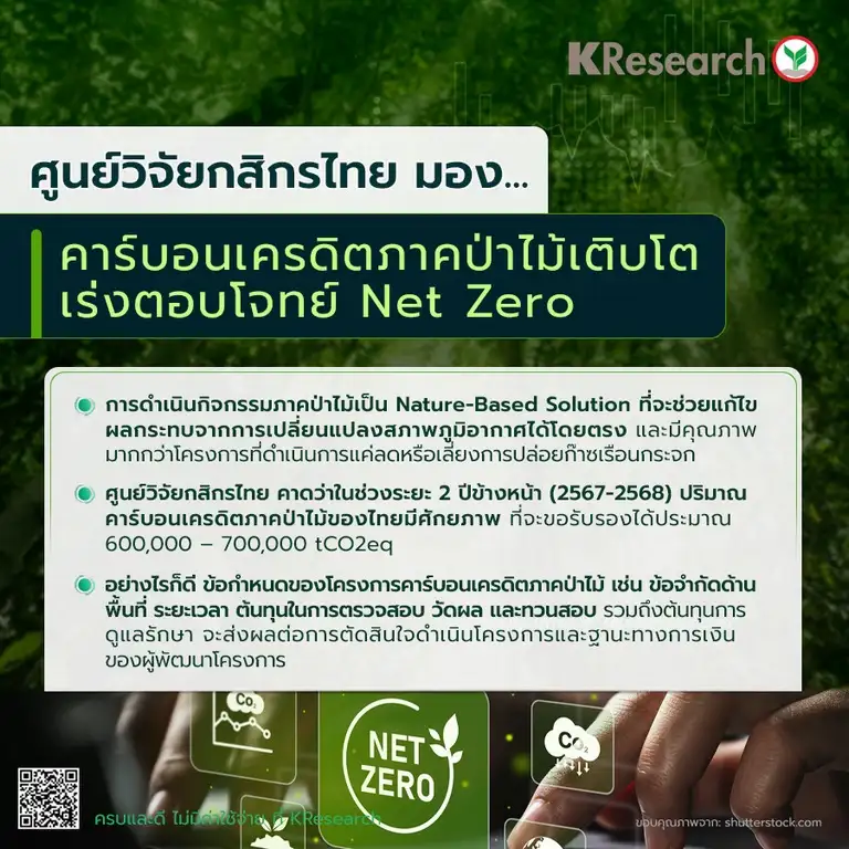 ศูนย์วิจัยกสิกรไทย ระบุว่า คาร์บอนเครดิตภาคป่าไม้ ได้รับจากการดำเนินโครงการประเภทดูดกลับก๊าซเรือนกระจกมากักเก็บไว้ (Carbon removal projects) ซึ่งเป็นที่นิยมมากกว่าคาร์บอนเครดิตจากโครงการทั่วไปที่แค่ลดหรือเลี่ยงการปล่อยก๊าซเรือนกระจก (Carbon reduction/ avoidance projects) เนื่องจากก่อให้เกิดผลประโยชน์ร่วมอื่นๆ ซึ่งมีสร้างมูลค่าทางเศรษฐกิจแก่ชุมชน (Co-benefit) เช่น แหล่งอาหาร สร้างอาชีพ แหล่งต้นน้ำ การป้องกันมลพิษ และภัยพิบัติทางธรรมชาติ เป็นต้น ดังนั้น ป่าไม้จึงเป็นอีกหนึ่ง Solution ที่สามารถสร้างมูลค่าที่เกิดจากคาร์บอนเครดิต ซึ่งจะตอบโจทย์การเป็นสังคมปลอดคาร์บอนได้