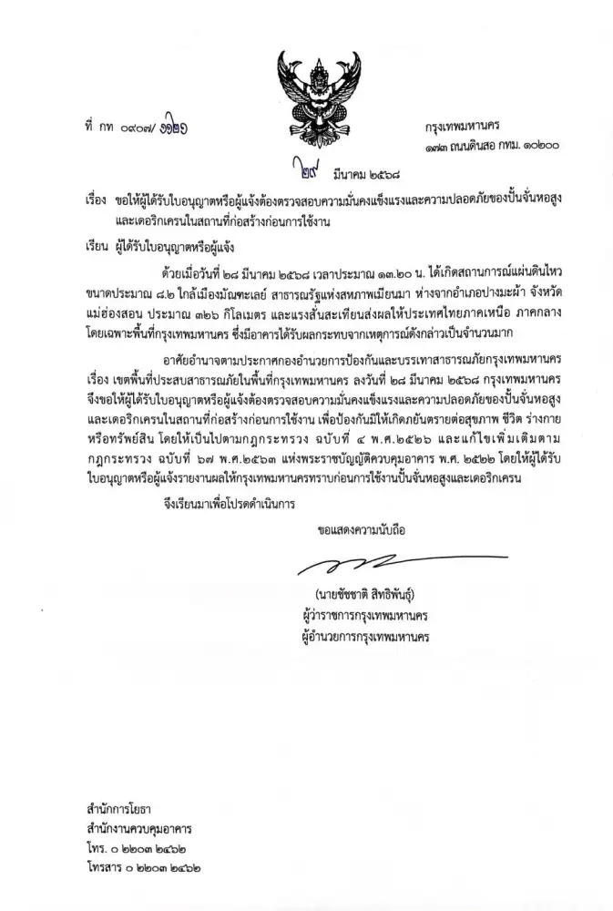 พร้อมกันนี้ ขอความร่วมมือผู้ได้รับใบอนุญาตหรือผู้แจ้ง ต้องตรวจสอบความมั่นคงแข็งแรงและความปลอดภัยของปั้นจั่นหอสูงและเดอริกเครนในสถานที่ก่อสร้างก่อนการใช้งาน เพื่อป้องกันมิให้เกิดภยันตรายต่อสุขภาพ ชีวิต ร่างกายหรือทรัพย์สิน