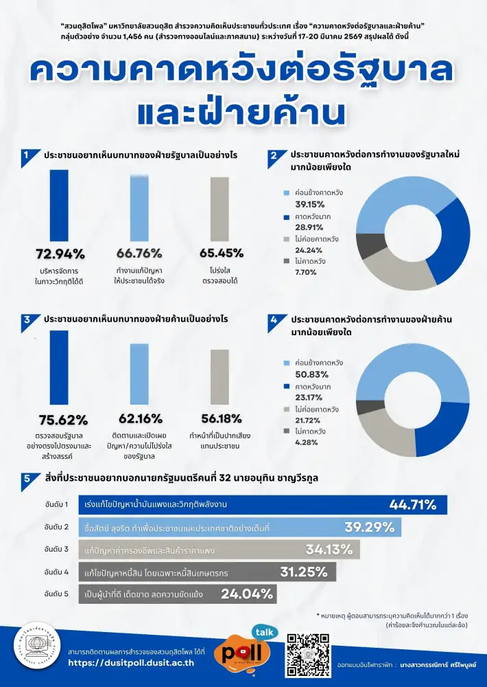 ฝ่ายค้าน" กลุ่มตัวอย่าง จำนวน 1,456 คน (สำรวจทางออนไลน์และภาคสนาม) ระหว่างวันที่ 17-20 มีนาคม 2569