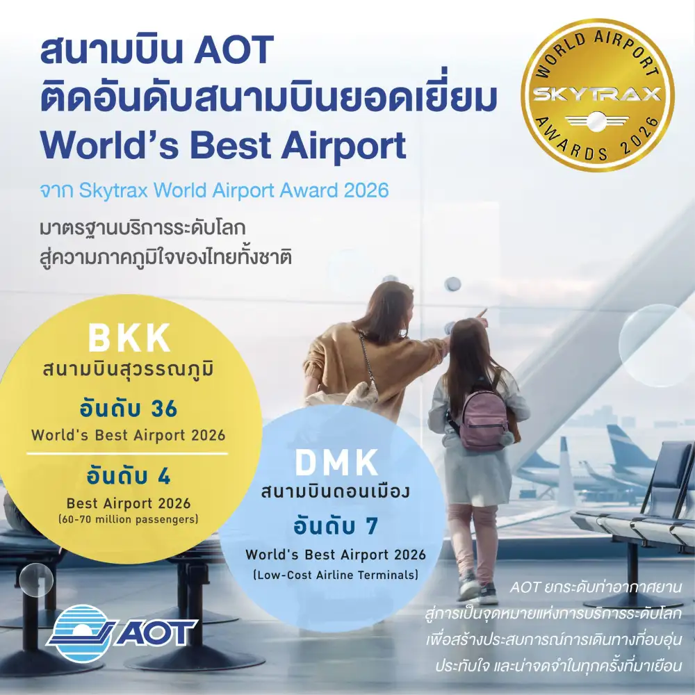 นางสาวปวีณา จริยฐิติพงศ์ กรรมการผู้อำนวยการใหญ่ บริษัท ท่าอากาศยานไทย จำกัด (มหาชน) (AOT) กล่าวว่า ท่าอากาศยานสุวรรณภูมิ (ทสภ.) คว้าอันดับ 4 ประจำปี 2026 ในกลุ่มสนามบินที่สามารถรองรับผู้โดยสาร 6070 ล้านคนต่อปี (Best Airport 2026: 60 to 70 million passengers) จาก Skytrax ซึ่งเป็นองค์กรจัดอันดับการให้บริการสนามบินระดับโลก ซึ่งเป็นการสะท้อนถึงการพัฒนาและยกระดับคุณภาพการให้บริการอย่างต่อเนื่อง