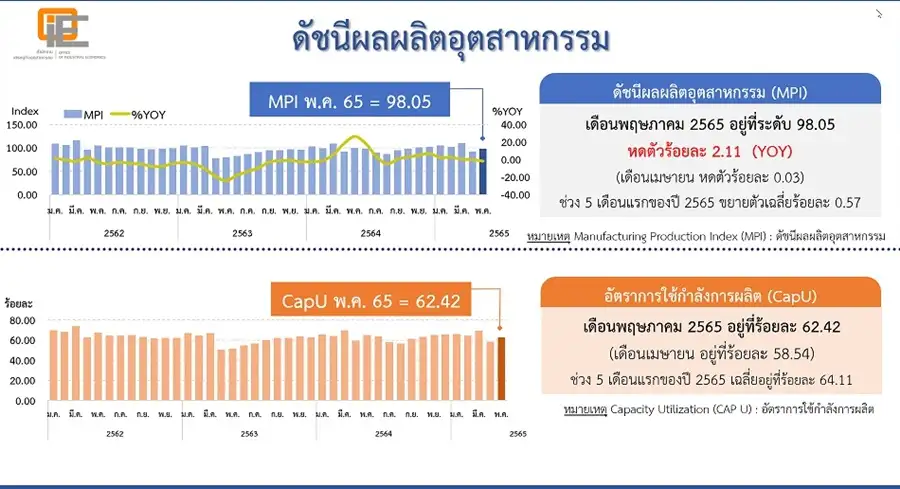 นางศิริเพ็ญ เกียรติเฟื่องฟู รองผู้อำนวยการสำนักงานเศรษฐกิจอุตสาหกรรม (สศอ.) เปิดเผยว่า ดัชนีผลผลิตอุตสาหกรรม (MPI) เดือน พ.ค. 65 อยู่ที่ระดับ 98.05 หดตัว 2.11% เมื่อเทียบกับช่วงเดียวกันของปีก่อน (YoY) แต่ขยายตัวจากเดือนก่อน (MoM) 7.46% ทำให้ในช่วง 5 เดือนแรกของปีนี้ (ม.ค.-พ.ค.) ขยายตัวเฉลี่ย 0.57%