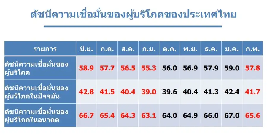 ศูนย์พยากรณ์เศรษฐกิจและธุรกิจ มหาวิทยาลัยหอการค้าไทย เปิดเผยว่า ดัชนีความเชื่อมั่นของผู้บริโภค เดือนก.พ.68 อยู่ที่ระดับ 57.8 ปรับตัวลดลงเป็นครั้งแรกในรอบ 5 เดือน นับตั้งแต่ ต.ค.67 เนื่องจากผู้บริโภคมีความกังวลเกี่ยวกับสงครามการค้าจากนโยบาย Trump 2.0 ส่งผลให้ตลาดหลักทรัพย์ของไทยและทั่วโลกปรับตัวลดลง แม้ว่ารัฐบาลจะออกมาตราการกระตุ้นเศรษฐกิจ แต่ผู้บริโภคกลับรู้สึกว่าเศรษฐกิจไทยยังฟื้นตัวได้ช้า