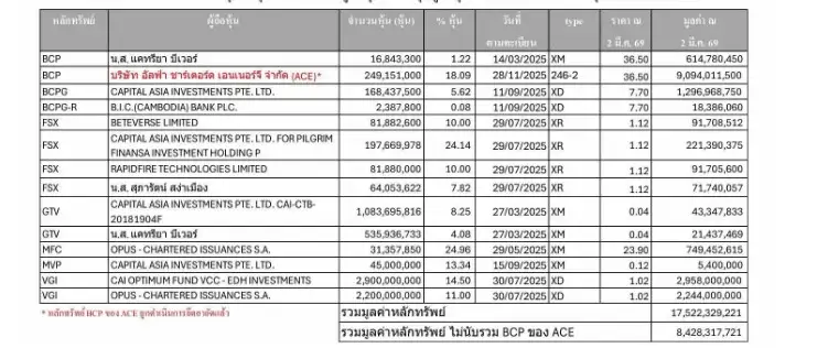 นายกรณ์ กล่าวว่า ในกรณีของหุ้น BCPG พรรคประชาธิปัตย์ได้แจ้งเตือนตั้งแต่ปลายปี 68 แล้วว่า ข้อมูลจากรายงานผู้ถือหุ้น ณ เดือน ก.ย.68 ระบุว่ากองทุน CAI ถือหุ้น BCPG ราว 168.4 ล้านหุ้น หรือ 5.62% และปรากฏอยู่ในรายงานประจำปี 68 และจนถึงปัจจุบันไม่ได้มีรายงานการขายหลักทรัพย์ผ่านจุด 5% ลงมาแต่อย่างใด แต่เมื่อวันที่ 5 มี.ค.69 ปรากฏว่าการถือครองหุ้นของ CAI ลดเหลือเพียง 21.237 ล้านหุ้น หรือ 0.71% เท่านั้น สะท้อนให้เห็นว่ามีการขายหุ้นออกไปเกือบทั้งหมด ทั้ง ๆ ที่หุ้น BCPG นั้นเป็นทรัพย์สินที่ควรถูกอายัดไว้ตรวจสอบตั้งแต่ต้น เนื่องจากเชื่อมโยงโดยตรงกับกลุ่มบุคคลที่เกี่ยวข้องกับการกระทำความผิดตามที่พรรคได้ส่งหนังสือแจ้งไว้แล้ว