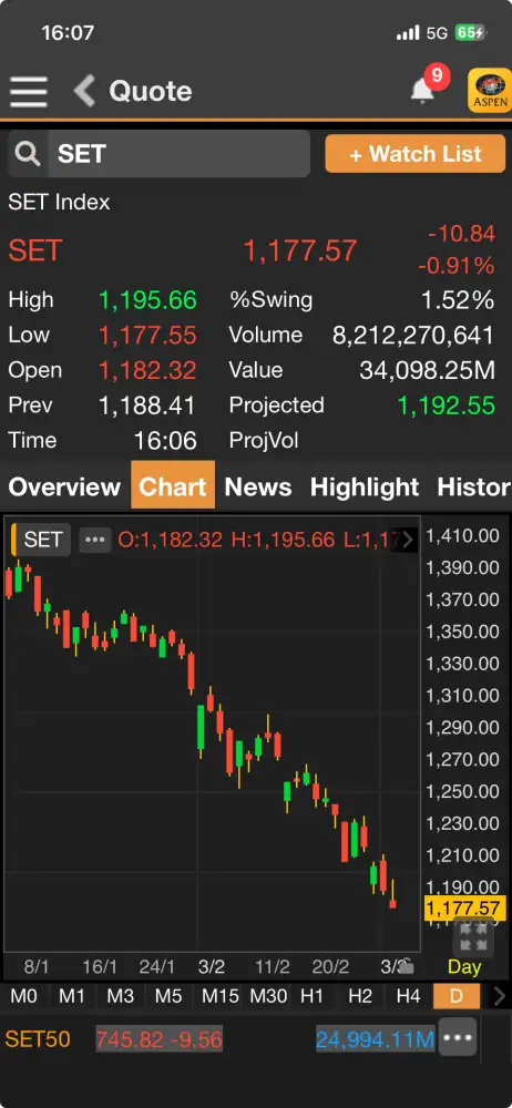 เมื่อเวลา 16.06 น.ดัชนี SET มาอยู่ที่ 1,177.57 จุด ลดลง 10.84 จุด (-0.91%)