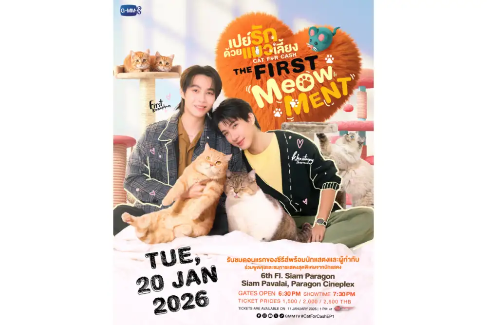 เตรียมตัวอารมณ์ดีประเดิมต้นปีกับซีรีส์สุดน่ารัก "เปย์รักด้วยแมวเลี้ยง" เหนื่อยใจเติมรัก เหนื่อยนัก เติมแมว จาก "GMMTV" คอนเทนต์โพรไวเดอร์ชั้นนำของเมืองไทย ที่พร้อมลงจอให้อบอุ่นหัวใจ กับฝีมือการแสดง ของ 2 คู่ฮอตสุดปัง "เฟิร์ส คณพันธ์ ปุ้ยตระกูล" และ "ข้าวตัง ธนวัฒน์ รัตนกิจไพศาล" ที่จับมือกันเปิดประตู คาเฟ่แมวสุดแปลก อัปเลเวลความเหมียว บอกรักผ่านภาษาแมว ชวนแฟนๆ รับชมตอนแรกพร้อมกัน ในงาน "เปย์รักด้วยแมวเลี้ยง THE FIRST MeOwMENT" พร้อมด้วยผู้กำกับฯ คนเก่ง "กรพรหม นิยมศิลป์" ที่จะ มาร่วมพูดคุยถึงเบื้องหน้าเบื้องหลังการทำงาน และพิเศษสุดๆ กับสเปเชียลโชว์สุดเอ็กซ์คลูซีฟจากเหล่านักแสดงพร้อมโมเมนต์ฟินๆ มามอบให้แฟนๆ แบบเต็มอิ่มสุดๆ ในวันอังคารที่ 20 มกราคม 2569 เวลา 19.30 น. ที่ ชั้น 6 สยามพารากอน - โรงภาพยนตร์สยามภาวลัย Paragon Cineple