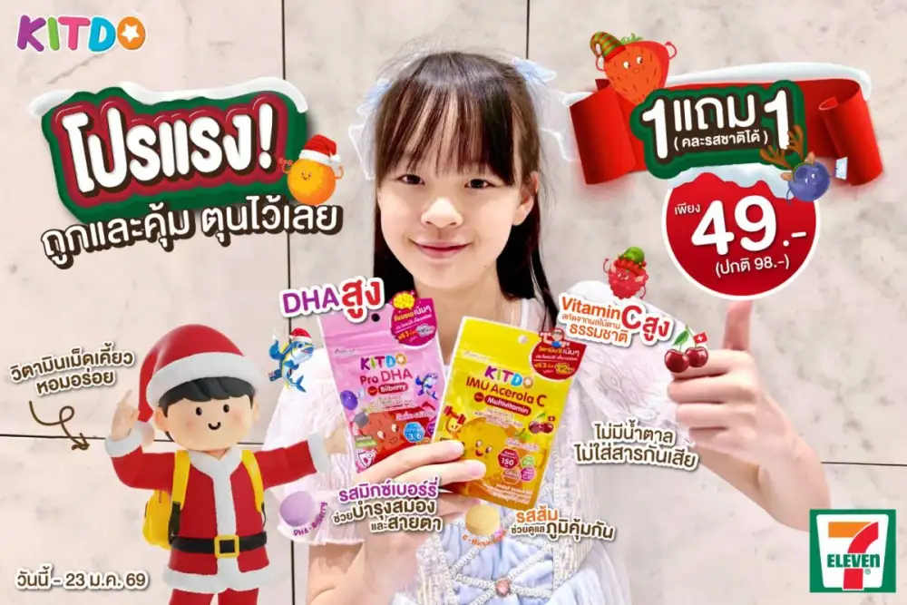 รายละเอียดโปรโมชั่นพิเศษ :คิทโด้ 1 ซอง บรรจุ 15 เม็ด (12 เม็ด พร้อมแถมฟรี 3 เม็ดภายในซอง) จัดโปรสุดคุ้ม! เพื่อหนูๆ น้องๆ "ซื้อ 1 แถม 1" (คละรสชาติได้) ในราคาเพียง 49 บาท (จากราคาปกติ 98 บาท) และสิทธิพิเศษสำหรับสมาชิก All Member ลดเพิ่มเหลือเพียง 48 บาท เริ่มตั้งแต่วันนี้ - 23 มกราคม 2569 ที่ร้านเซเว่น อีเลฟเว่น ทุกสาขาทั่วประเทศ