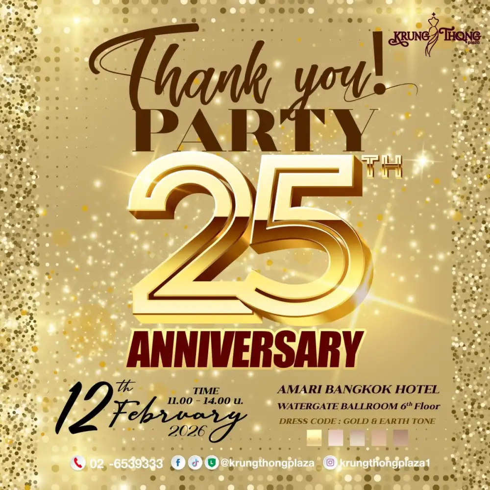 ห้างกรุงทองพลาซา ศูนย์ค้าส่งเสื้อผ้าพลัสไซส์ที่ใหญ่ที่สุดในประเทศไทย ประกาศความสำเร็จครั้งยิ่งใหญ่ในโอกาสครบรอบ 25 ปี เตรียมจัดงาน "Krungthong Plaza Thank You Party 25th Anniversary" เพื่อตอบแทนคำขอบคุณลูกค้า พันธมิตรทางธุรกิจ และผู้สนับสนุนที่อยู่เคียงข้างกันมาอย่างยาวนานในเดือนแห่งความรัก วันที่ 12 กุมภาพันธ์นี้ ณ โรงแรมอมารี กรุงเทพ