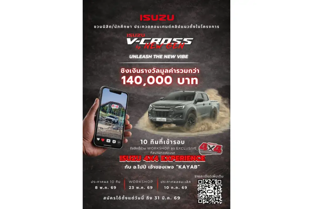 อีซูซุชวนน้อง ๆ นิสิต นักศึกษา นำเสนอไอเดียสุดครีเอทีฟผ่านการแข่งขันการทำคลิปวิดีโอแนวตั้ง ความยาวไม่เกิน 2 นาที ผ่านโครงการ Isuzu V-Cross by New Gen 2026 ภายใต้หัวข้อรอบคัดเลือก "ถ้า ISUZU V-CROSS เป็นคน จะเป็นคนแบบไหน" ผู้สนใจสามารถสมัครเข้าร่วมการแข่งขัน ได้ทั้งในรูปแบบรายบุคคล หรือแบบทีม ทีมละไม่เกิน 5 คน โดยไม่จำกัดสถาบัน คณะ หรือชั้นปีการศึกษา พิเศษสำหรับผู้เข้ารอบ 10 ทีมสุดท้าย จะได้ร่วมสัมผัสสมรรถนะปิกอัพสปอร์ตออฟโรด ISUZU V-CROSS 4x4 "THE ONE & ONLY" พร้อมเรียนรู้เทคนิคการทำคอนเทนต์แบบมืออาชีพกับคุณฤกษ์อรุณ เจียมสวัสดิ์ เจ้าของเพจ "Kayab" เพื่อเพิ่มประสบการณ์ด้านการสร้างสรรค์คอนเทนต์ให้แก่ ทีมที่ผ่านเข้ารอบ ก่อนเข้าสู่การแข่งขันรอบชิงชนะเลิศ ณ สนามทดสอบรถ Isuzu 4x4 Experience จังหวัดปทุมธานี ชิงเงินรางวัลรวมมูลค่ากว่า 140,000 บาท