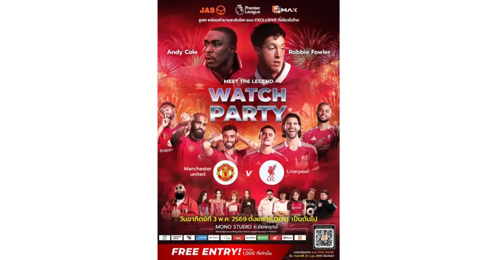แฟนบอลชาวไทยเตรียมตัวให้พร้อมกับครั้งแรกที่ 2 ตำนานแดงเดือดจะปรากฏตัวพร้อมกันในประเทศไทย!!! บริษัท จัสมิน อินเตอร์เนชั่นแนล จำกัด (มหาชน) หรือ JAS ผู้ถือลิขสิทธิ์ฟุตบอลพรีเมียร์ลีกอังกฤษ และเอมิเรตส์เอฟเอคัพอย่างเป็นทางการ ร่วมกับ Monomax แพลตฟอร์มหลักในการถ่ายทอดสดฟุตบอลพรีเมียร์ลีกและเอมิเรตส์เอฟเอคัพตลอด 6 ฤดูกาล ชวนแฟนผีและเด็กหงส์ร่วมสร้างประสบการณ์ลูกหนังสุดเอ็กซ์คลูซีฟครั้งใหญ่ในไทยและรวมพลังส่งเสียงเชียร์บิ๊กแมตช์แดงเดือด "MONOMAX WATCH PARTY: RED MATCH" ระหว่าง แมนเชสเตอร์ ยูไนเต็ด พบ ลิเวอร์พูล พร้อมกระทบไหล่ 2 ตำนานดาวยิงระดับโลก บินตรงร่วมเชียร์ติดขอบจอ ในวันอาทิตย์ที่ 3 พฤษภาคม 2569 ตั้งแต่เวลา 16.00 น. เป็นต้นไป ณ Mono Studio