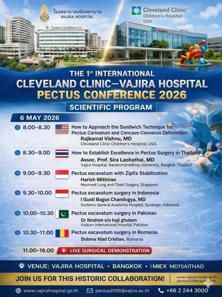โรงพยาบาลวชิรพยาบาลเตรียมจัดงานประชุมนานาชาติด้านโรคอกบุ๋มครั้งแรกของประเทศไทย "Pectus Conference 2026" ในวันที่ 6 พฤษภาคมนี้ ร่วมกับ Cleveland Clinic Children's Hospital ประเทศสหรัฐอเมริกา สะท้อนให้เห็นถึงความสำคัญของโรคอกบุ๋ม(Pectus Excavatum) ที่กำลังได้รับความสนใจมากขึ้นในวงการแพทย์ระดับโลก