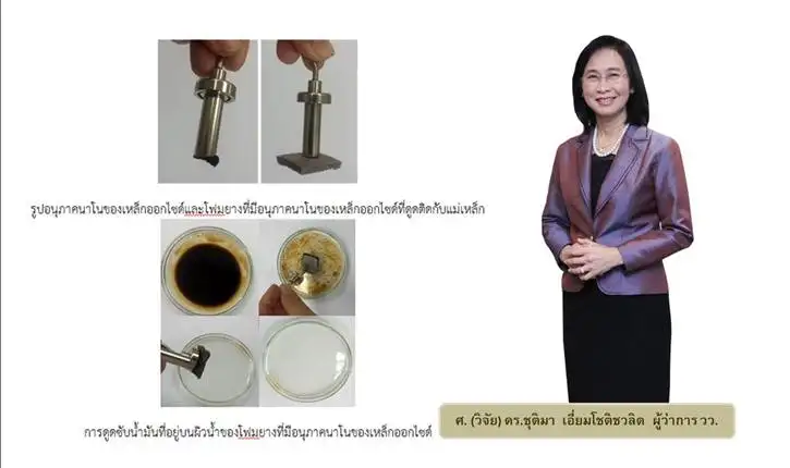ศ. (วิจัย) ดร.ชุติมา เอี่ยมโชติชวลิต ผู้ว่าการ วว. กล่าวว่า ปัญหาน้ำมันรั่วไหลทางทะเลเป็นปัญหามลภาวะที่สำคัญเนื่องจากเกิดขึ้นบ่อยครั้งในช่วงหลายสิบปีที่ผ่านมา ซึ่งส่งผลกระทบอย่างเฉียบพลันและระยะยาวต่อสุขภาพของ มนุษย์ สัตว์ สิ่งแวดล้อม รวมถึงระบบนิเวศ การพัฒนาวัสดุดูดซับน้ำมันที่มีราคาถูกและเหมาะสำหรับการดูดซับน้ำมันเป็นสิ่งที่จำเป็นยิ่ง วว. โดย ศูนย์เชี่ยวชาญนวัตกรรมวัสดุ จึงได้ดำเนินโครงการพัฒนาวัสดุดูดซับจากยางพาราสำหรับการขจัดน้ำมันปนเปื้อน (Development of Natural Rubber Sorbent Material for Oil Decontamination) และประสบผลสำเร็จในการวิจัยและพัฒนา "วัสดุดูดซับจากยางพารานาโนเทคโนโลยีสำหรับการขจัดน้ำมันปนเปื้อน" ในระดับห้องปฏิบัติการ โดยใช้น้ำยางธรรมชาติเป็นวัตถุดิบหลักในการพัฒนาผลิตภัณฑ์นี้ให้อยู่ในรูปแบบโฟมยาง ใช้งานง่าย เคลื่อนย้ายสะดวก และเป็นมิตรกับสิ่งแวดล้อม
