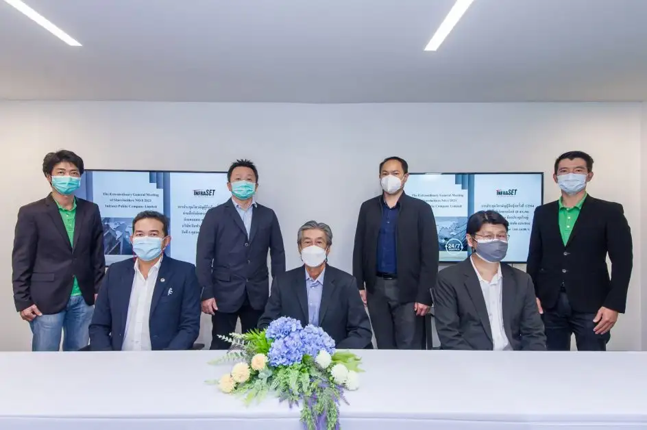 คุณกัมปนาท โลหเจริญวนิช (กลาง แถวหน้า) ประธานกรรมการ , คุณศักดิ์บวร พุกกะณะสุต (ที่ 1 จาก ซ้าย แถวหน้า) กรรมการผู้จัดการ พร้อมด้วยคณะกรรมการบริษัทและผู้บริหาร บริษัท อินฟราเซท จำกัด (มหาชน) INSET ถ่ายภาพร่วมกันหลังการประชุมวิสามัญผู้ถือหุ้นครั้งที่ 1/2564 โดยที่ประชุมมีมติเป็นเอกฉันท์อนุมัติเพิ่มทุนจดทะเบียน 153,999,991.50 บาท จากทุนจดทะเบียนเดิม 307,999,983 บาท โดยออกหุ้นสามัญเพิ่มทุนไม่เกิน 307,999,983 หุ้น เพื่อรองรับจัดสรรวอร์แรนท์ชุดที่ 1 ให้กับผู้ถือหุ้นเดิม ในอัตราส่วน 2 หุ้นเดิมต่อ 1 วอร์แรนท์ งานดังกล่าวจัดขึ้น ณ บริษัท อินฟราเซท จำกัด (มหาชน) เมื่อเร็วๆนี้
