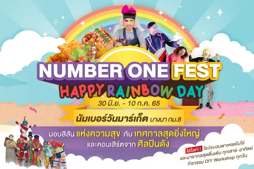 นัมเบอร์วัน มาร์เก็ต Community Market บางนา กม.8 ชวนร่วมงาน Number One Fest "Happy Rainbow Day" เทศกาลอาหารสุดยิ่งใหญ่ที่ตอบโจทย์ทุกคนในครอบครัว รวบรวมความอร่อยจากเมนูเด็ดร้านดังกว่า 200 ร้านค้า มากกว่า 1,000 เมนู พร้อมพบกันสีสันความสนุกจากก๊วนตัวตลกโบโซ่ มายากลโชว์ชื่อดัง และกิจกรรม Workshop DIY พบกันได้ที่งานวันที่ 30 มิ.ย. - 10 ก.ค. 65 ห้ามพลาด!!