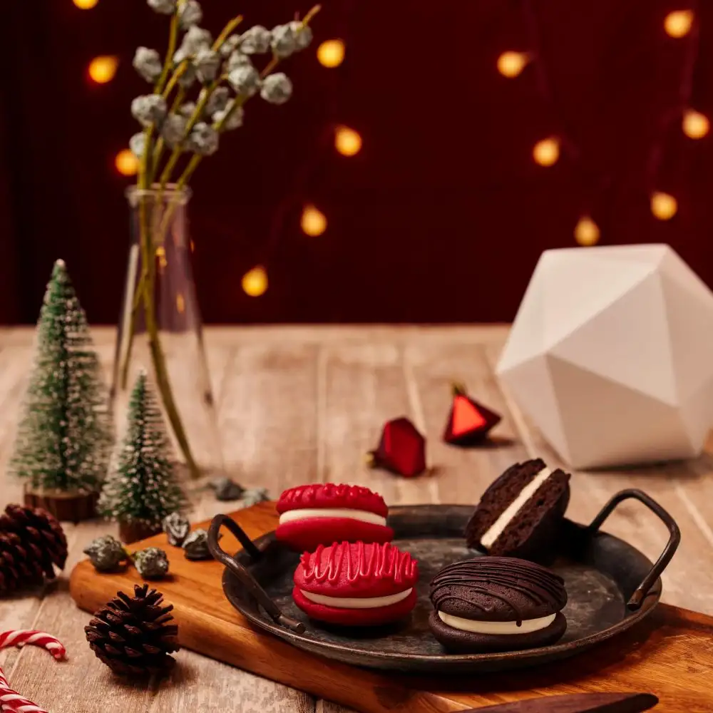 มาต่อกันที่เบเกอรี่สีสันโดนใจกันบ้างกับ "Whoopie Pie" ซึ่งเป็นขนมที่นิยมรับประทานกันมากในเทศกาลคริสต์มาส เนื้อคล้ายคุกกี้นิ่ม สลับชั้นกับ Butter Cream รสชาติเข้ากันอย่างลงตัว ทั้งอร่อยและกลมกล่อมมี 2 รสชาติ คือ Red Velvet Whoopie Pie และ Chocolate Whoopie Pie