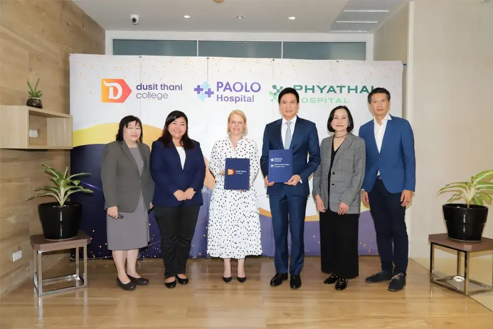 คุณอัฐ ทองแตง (ที่ 3 จากขวา) ประธานเจ้าหน้าที่บริหารเครือโรงพยาบาลพญาไท-เปาโล พร้อมด้วย คุณสุภาพร บัญชาจารุรัตน์ (ที่ 2 จากขวา) ผู้อำนวยการสายทรัพยากรบุคคล เครือโรงพยาบาลพญาไท-เปาโล และ คุณนิรุธ ศรีพวาทกุล (ที่ 1 จากขวา) ผู้อำนวยการสายพัฒนาคุณค่าธุรกิจและเพิ่มพูนการเรียนรู้ เครือโรงพยาบาลพญาไท-เปาโล ลงนามบันทึกข้อตกลงความร่วมมือกับ วิทยาลัยดุสิตธานี สถาบันอุดมศึกษาเอกชนชั้นนำทางด้านธุรกิจบริการในเครือโรงแรมดุสิตธานี นำโดย คุณฟราวเกอะ เกอร์เบน (ที่ 3 จากซ้าย) อธิการบดี วิทยาลัยดุสิตธานี และคณาจารย์ผู้ทรงคุณวุฒิ โดยความร่วมมือครั้งนี้เป็นความร่วมมือทางวิชาการเพื่อพัฒนาหลักสูตรการอบรมระยะยาวสำหรับบุคลากรในหน่วยงานที่เกี่ยวข้องของโรงพยาบาลพญาไทและเปาโล ในรูปแบบ Hybrid Learning ที่เน้นทักษะการให้บริการระดับสูง เพื่อส่งมอบประสบการณ์ที่ดีแก่กลุ่มลูกค้าโรงพยาบาลฯ ภายใต้มาตรฐานและคุณภาพระดับสากล โดยหลักสูตรฝึกอบรมนี้จะเริ่มวันที่ 16 มกราคม 2566