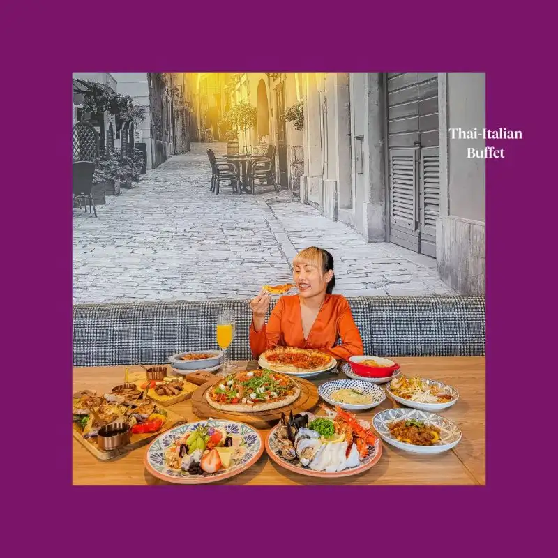 ซื้อ 1 แถม 1, บุฟเฟ่ต์บรั้นช์ รวมน้ำดื่มและน้ำอัดลมฟรีโฟลว์ + เครื่องดื่มต้อนรับ 1 แก้ว 1,950 บาทถ้วน*/ท่านวันอาทิตย์ เวลา 12:00 - 15:00 น.ไฮไลท์: พิซซ่าต้นตำรับจากเมืองเนเปิลส์ (Neapolitan-style Pizzas) สเตชั่นชีสนำเข้าและซาลามี่ แฮม Culatello สเตชั่นพาสต้าเส้นสดหรือราวิโอลีปรุงจานต่อจาน เมนูเรียกน้ำย่อยอุ่นร้อน สเตชั่นอาหารปรุงสดหลากหลาย เมนูอาหารอิตาเลียนสุดคลาสสิกและร่วมสมัย อาหารไทยขึ้นชื่อจากภาคต่างๆ+ Seafood on Ice อาหารทะเลสดๆ มากมาย อาทิ ปู Chilean หอยนางรมนำเข้า หอยแมลงภู่ กุ้งแม่น้ำ ร็อคล็อบสเตอร์ ปลาหมึก ปูม้า (สามารถแจ้งให้ย่างสุกได้)+ สเตชั่นเครื่องดื่มต้อนรับ (คนละ 1 แก้ว) เลือกได้ระหว่าง bubbles น้ำผลไม้ หรือสมูทตี้+ เมนูของหวานสไตล์ตะวันตก และไทย+ สเตชั่น A la Minute ให้เลือกสั่งเพิ่มเติม อาทิ พาสต้าและราวิโอลีเฮ้าส์เมด (เลือกได้ระหว่าง Spaghetti, Tagliatelle และ Angel hair / ซอส Bolognaise, Mushroom, Pesto และ Tomato), ไส้กรอกหมู เสิร์ฟพร้อมผักโขม, ผัดไทกุ้งสด, ผัดผักบุ้งไฟแดงน้ำมันหอย, คอหมูย่างสไตล์ไทย, ไก่ย่าง