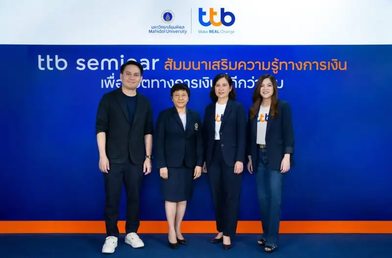 ทีเอ็มบีธนชาต หรือ ทีทีบี เสริมความรู้ทางการเงินให้กับบุคลากรมหาวิทยาลัยมหิดล หนึ่งในสถาบันการศึกษาที่ร่วมลงนามใช้บริการสินเชื่อสวัสดิการอเนกประสงค์ ทีทีบี แบบไม่มีหลักทรัพย์ค้ำประกัน ผ่าน "งานสัมมนาเสริมความรู้ทางการเงิน เพื่อชีวิตทางการเงินที่ดีกว่าเดิม" โดยมีนางสาวสมสวาท ลิขิตปรีดา (ที่ 3 จากซ้าย) หัวหน้าบริหารกลุ่มลูกค้าเงินเดือนและสิทธิประโยชน์ ทีเอ็มบีธนชาต ได้ให้ข้อมูลโซลูชันทางการเงิน "สินเชื่อสวัสดิการรวบหนี้" ที่จะช่วยบริหารจัดการหนี้อย่างเป็นระบบ แบ่งเบาภาระหนี้ และเสริมสภาพคล่อง ด้วยอัตราดอกเบี้ยต่ำพิเศษ และได้รับเกียรติจาก โค้ชหนุ่ม นายจักรพงษ์ เมษพันธุ์ (ซ้าย) The Money Coach มาร่วมแชร์แนวทางการวางแผนและบริหารจัดการทางการเงินฉบับมนุษย์เงินเดือน ที่จะช่วยจัดการรายได้ให้เพียงพอกับรายจ่าย ลดภาระหนี้และวางแผนการออม เพื่อช่วยยกระดับคุณภาพชีวิตของบุคลากรและเจ้าหน้าที่ในสังกัดมหาวิทยาลัยมหิดล ซึ่งได้รับความสนใจเข้าร่วมฟังเป็นจำนวนมาก ตอกย้ำความมุ่งมั่นของทีทีบีที่ต้องการปล่อยสินเชื่ออย่างรับผิดชอบ และส่งเสริมให้พนักงานเงินเดือนมีชีวิตทางการเงินที่ดีขึ้นรอบด้านอย่างแท้จริง โดยมีนางสาวนันทพร ตั้งเจริญศิริ (ขวา) รองประธานเจ้าหน้าที่บริหาร หัวหน้าบริหารความสัมพันธ์และประสบการณ์ลูกค้าบุคคล ทีเอ็มบีธนชาต ร่วมงาน และผู้ช่วยศาสตราจารย์ ดร.เอื้อมพร มัชฌิมวงศ์ (ที่ 2 จากซ้าย) รองอธิการบดีฝ่ายการคลัง มหาวิทยาลัยมหิดล ให้การต้อนรับ ณ มหาวิทยาลัยมหิดล วิทยาเขตศาลายา เมื่อเร็ว ๆ นี้