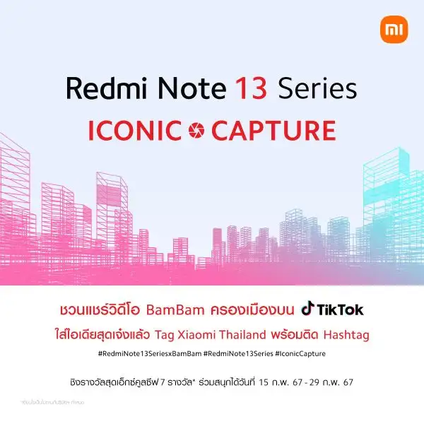 เสียวหมี่ ประเทศไทย จัดกิจกรรมพิเศษ 'Redmi Note 13 Series ICONIC CAPTURE' ชวนคุณมาครีเอทคลิปวิดีโอภาพบรรยากาศสื่อโฆษณา Redmi Note 13 Series ที่มีอยู่ทั่วเมือง ความยาวอย่างน้อย 15 วินาที แล้วโพสต์ลงบนช่องทาง TikTok ของคุณ พร้อมติดแฮชแท็ก #RedmiNote13SeriesxBamBam #RedmiNote13Series #IconicCapture แล้ว tag มาที่ Xiaomi Thailand เพื่อลุ้นเป็นผู้ชนะรับรางวัลสุดเอ็กซ์คูลซีฟจากเสียวหมี่* โดยคลิปวิดีโอที่มียอดไลค์สูงสุดจะได้รับสมาร์ทโฟน Redmi Note 13 Pro+ 5G พร้อมลายเซนต์ BamBam แอมบาสเดอร์คนแรกของ เสียวหมี่ อินเตอร์เนชั่นแนล ภูมิภาคเอเชียตะวันออกเฉียงใต้ ภายใต้สมาร์ทโฟนรุ่น Redmi Note 13 Series ไปครอง ผู้ที่สนใจสามารถร่วมสนุกได้ตั้งแต่วันนี้ถึงวันที่ 29 กุมภาพันธ์ 2567 และจะประกาศผลผู้ชนะรางวัลในวันที่ 5 มีนาคม 2567 โดยสามารถดูรายละเอียดและติดตามข้อมูลเพิ่มเติมได้ที่ Facebook Page ของ Xiaomi Thailand
