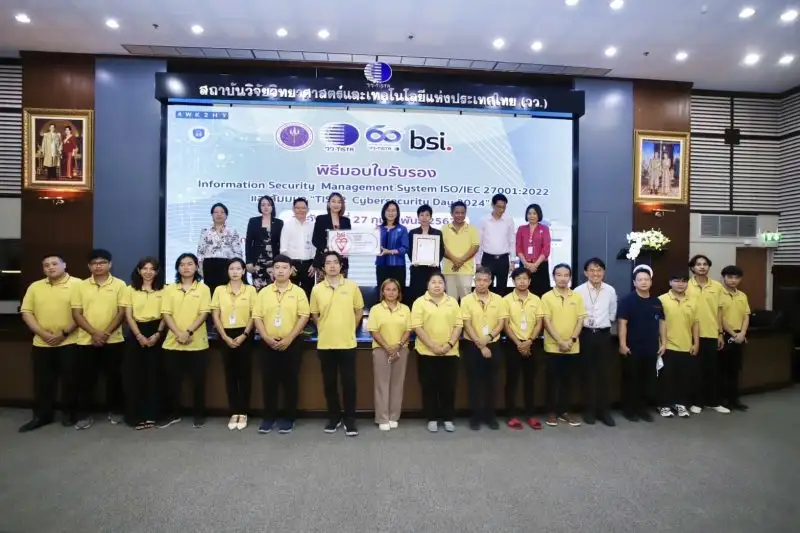 ดร.ชุติมา เอี่ยมโชติชวลิต ผู้ว่าการ สถาบันวิจัยวิทยาศาสตร์และเทคโนโลยีแห่งประเทศไทย (วว.) กระทรวงการอุดมศึกษา วิทยาศาสตร์ วิจัยและนวัตกรรม (อว.) รับมอบใบรับรองความสามารถตามมาตรฐาน ISO/IEC 27001 : 2022 ระบบมาตรฐานความปลอดภัยสารสนเทศ จาก นางสาวรุจิรา ศรีสุขใส Key Account Director, Assurance - Thailand Sales & Marketing ผู้แทน BSI Group (Thailand) Co.,Ltd. ซึ่งเป็นองค์กรที่สร้างมาตรฐานสำหรับอุตสาหกรรมแห่งชาติแห่งแรกของโลก และเป็นองค์กรหลักระหว่างประเทศด้านมาตรฐานสากล (ISO) เพื่อสร้างมาตรฐานที่ตอบสนองต่อความจำเป็นทางธุรกิจและความต้องการของสังคม ซึ่ง วว. โดย กองพัฒนาระบบดิจิทัล (กพท.) สำนักดิจิทัลและสารสนเทศ (สทส.) ได้ดำเนินงานด้านการพัฒนาเทคโนโลยีดิจิทัล ตามกรอบมาตรฐานความมั่นคงปลอดภัยด้านสารสนเทศ ISO/IEC 27001 : 2022 มาอย่างต่อเนื่อง 6 ปีเต็ม โดยมีวัตถุประสงค์สำคัญในการธำรงรักษาไว้ซึ่งความมั่นคงปลอดภัยด้านเทคโนโลยีสารสนเทศ ของ วว. ในการนี้ ดร.พัชทรา มณีสินธุ์ รองผู้ว่าการบริหาร พร้อมด้วยผู้บริหาร บุคลากร วว. เข้าร่วมเป็นเกียรติและแสดงความยินดีด้วย ในวันที่ 27 กุมภาพันธ์ 2567 ณ ห้องประชุมใหญ่ชั้น 5 อาคาร Admin วว. เทคโนธานี คลองห้า จังหวัดปทุมธานี