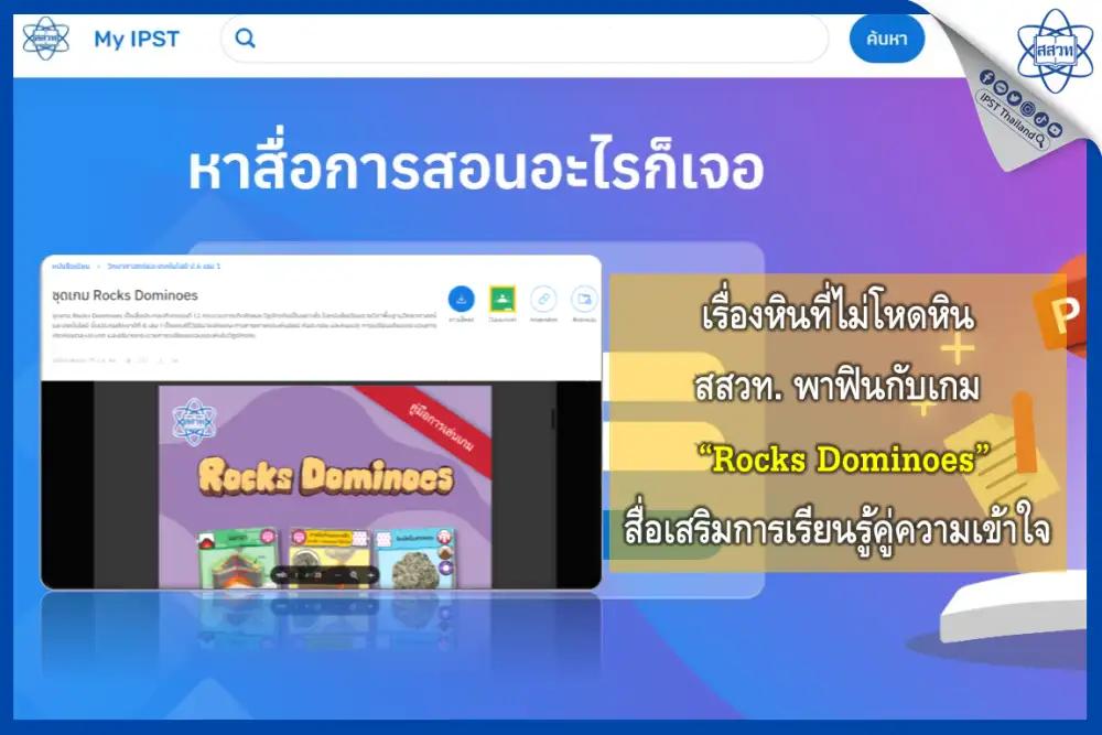 สถาบันส่งเสริมการสอนวิทยาศาสตร์และเทคโนโลยี (สสวท.) พาชั้นเรียนสนุกสร้างสรรค์เนื้อหากระบวนการเกิดหิน วัฏจักรหิน การนำหินและแร่ไปใช้ประโยชน์กับ เกม Rocks Dominoes สื่อเสริมความเข้าใจกิจกรรมกระบวนการเกิดหินและวัฏจักรหิน เกมเพื่อการเรียนรู้และอธิบายลักษณะทางกายภาพของหินอัคนี หินตะกอน และหินแปร เปรียบเทียบกระบวนการเกิดหินแต่ละประเภท และอธิบายกระบวนการเปลี่ยนแปลงของหินในวัฏจักรหิน สอดคล้องกับหนังสือเรียนรายวิชาพื้นฐานวิทยาศาสตร์และเทคโนโลยี ประถมศึกษาปีที่ 6 เล่ม 1 ดาวน์โหลดเกมพร้อมคู่มือการเล่นเกมที่ คลังสื่อการสอน MyIPST สสวท. https://myipst.ipst.ac.th/medias/Rocks%20Dominoes