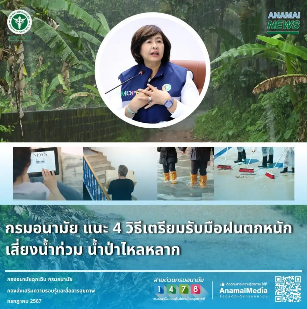 แพทย์หญิงอัจฉรา นิธิอภิญญาสกุล อธิบดีกรมอนามัย กล่าวว่า จากสถานการณ์การพยากรณ์อากาศ ของกรมอุตุนิยมวิทยา ในช่วงวันที่ 29 กรกฎาคม - 1 สิงหาคม 2567 ประกาศแจ้งเตือนหลายพื้นที่ของประเทศไทยอาจเสี่ยงเกิดฝนตกหนักถึงหนักมาก และฝนที่ตกสะสมในพื้นที่บริเวณภาคเหนือ และตอนบนของภาคตะวันออกฉียงเหนือ โดยเฉพาะพื้นที่ลาดเชิงเขาใกล้ทางน้ำไหลผ่านและพื้นที่ลุ่ม อาจส่งผลทำให้เกิดน้ำท่วมฉับพลัน และน้ำป่าไหลหลากได้ จึงขอให้ประชาชนที่อยู่ในพื้นที่เสี่ยงติดตามสถานการณ์อย่างใกล้ชิด เฝ้าระวังอันตรายจากสถานการณ์ดังกล่าว รวมทั้งเพิ่มความระมัดระวังในการเดินทางในบริเวณที่ที่มีฝนฟ้าคะนอง จึงขอให้ประชาชนที่อยู่ในพื้นที่เสี่ยงเกิดฝนตกหนัก และน้ำท่วมฉับพลัน เตรียมความพร้อมรับมือกับสถานการณ์น้ำท่วมโดยปฏิบัติตน ดังนี้ 1) ติดตาม ข้อมูลข่าวสารจากหน่วยงานราชการอย่างใกล้ชิด ผ่านช่องทางเสียงตามสาย วิทยุ โทรทัศน์ หรือช่องทางออนไลน์ต่าง ๆ
