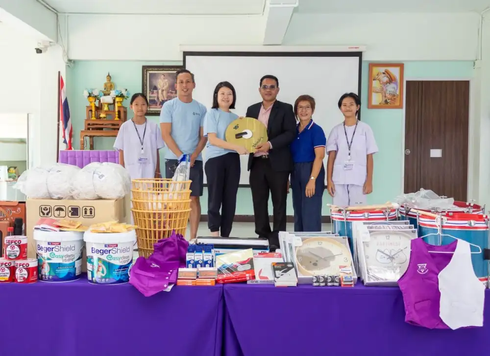 นายอาชวิน จันจำรัส ผู้อำนวยการโรงเรียนอนุบาลบางใหญ่ สังกัดสำนักงานเขตพื้นที่การศึกษาประถมศึกษานนทบุรี เขต 2 และตัวแทนนักเรียนรับมอบอุปกรณ์กีฬา เครื่องดนตรี และวัสดุอุปกรณ์ปรับปรุงพัฒนาศักยภาพนักเรียนและโรงเรียนจากบริษัทจีไอซี ไพรเวท จำกัด ประเทศสิงคโปร์ นำโดยนางสาวหว่อง ไอ เชียท กรรมการผู้จัดการ และ มร.เกลนนอน เจีย ฉีฉวน รองประธานด้านการบริหารจัดการธุรกิจองค์กรและความมั่นคงในสถานที่ทำงาน ภายใต้การประสานงานของมูลนิธิ EDF (มูลนิธิกองทุนการศึกษาเพื่อการพัฒนา)