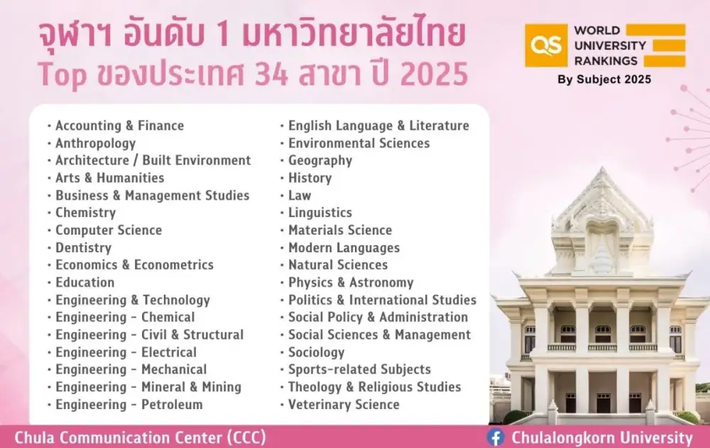 จุฬาลงกรณ์มหาวิทยาลัยได้รับการจัดอันดับให้เป็นมหาวิทยาลัยอันดับ 1 ของไทยถึง 34 สาขา จากการจัดอันดับโดย QS University Rankings by Subject 2025 ซึ่งประกาศผลเมื่อวันที่ 12 มีนาคม 2568