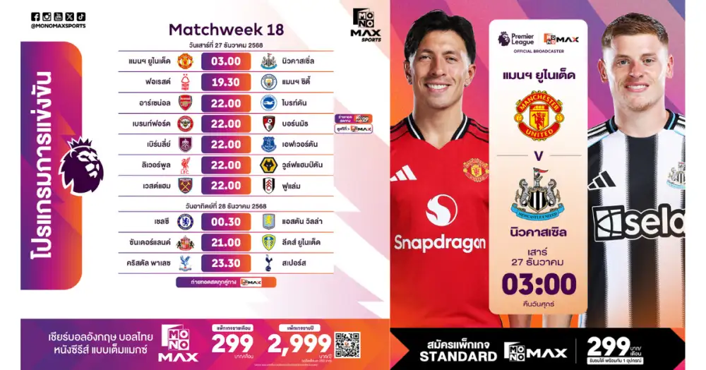 16 ธ.ค. –ThaiPR.net ศึกฟุตบอลพรีเมียร์ลีกอังกฤษเดินหน้าเข้าสู่ช่วงโปรแกรมเข้มข้นปลายเดือน สัปดาห์นี้เปิดฉากตั้งแต่คืน วันเสาร์ที่ 20 ธันวาคม 2568 ก่อนต่อเนื่องไปสู่...